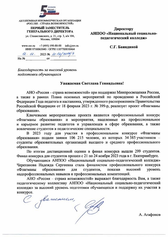 Будущий учитель начальных классов Надежда Черепанова прошла заочный тур соревнования молодых специалистов «Флагманы образования». Организаторы конкурса — Министерство просвещения РФ и и АНО «Россия — страна возможностей». Мероприятие направлено на поддержку активных и талантливых студентов.